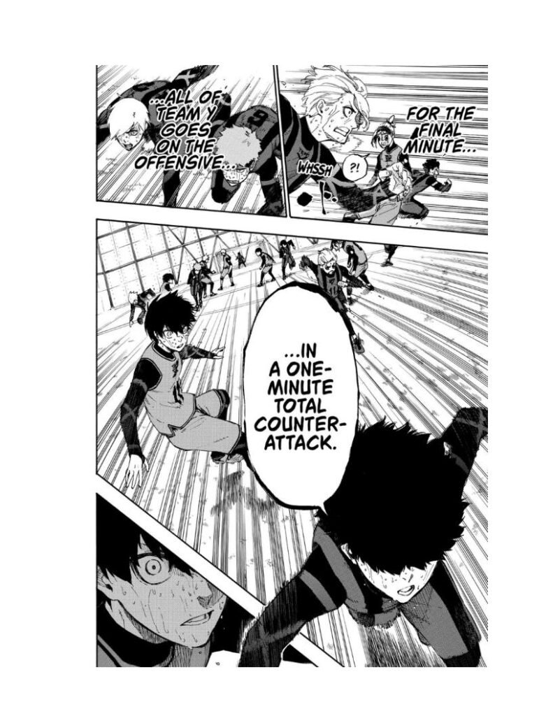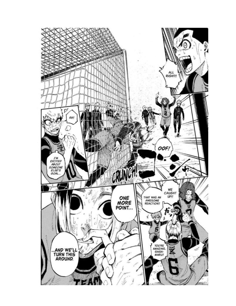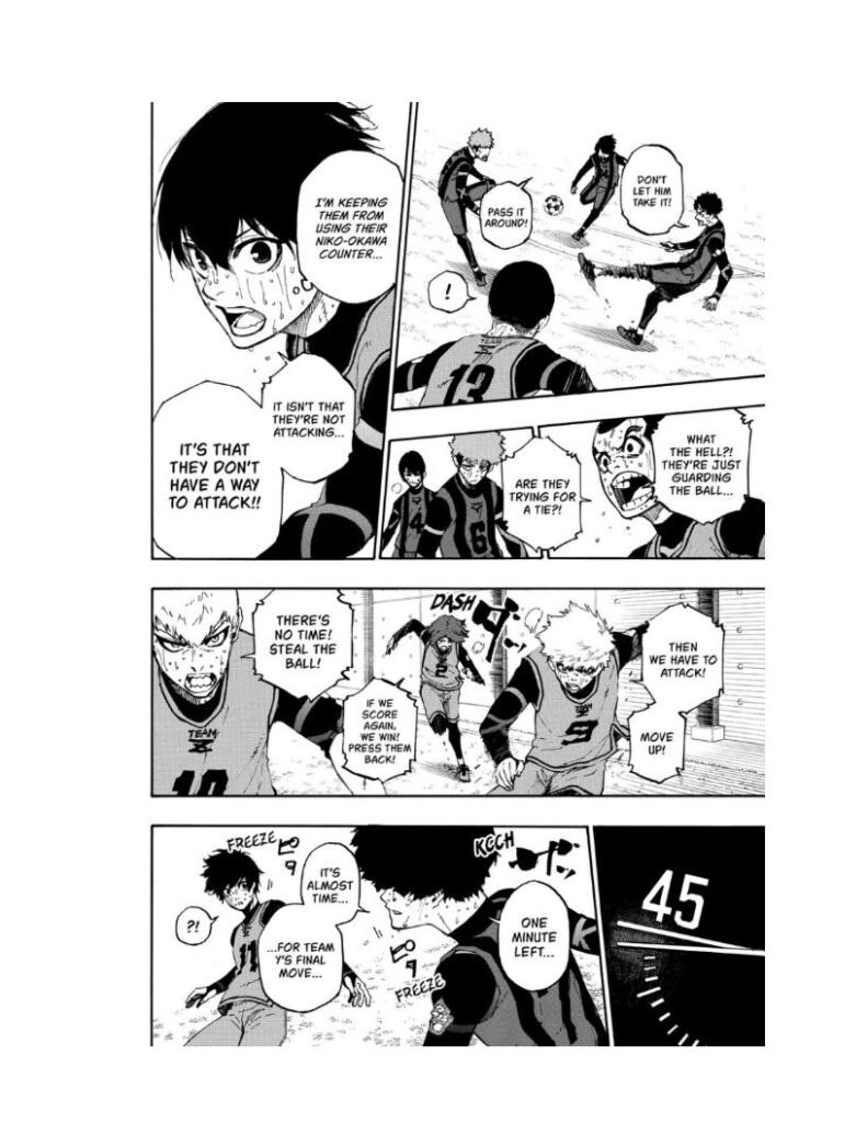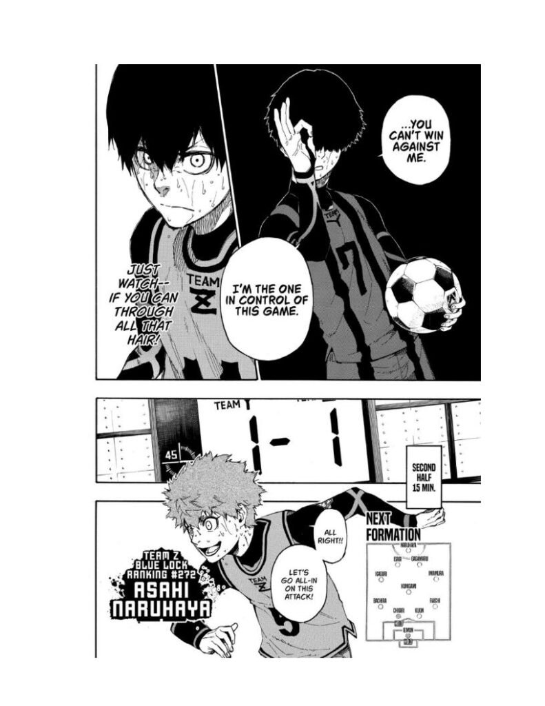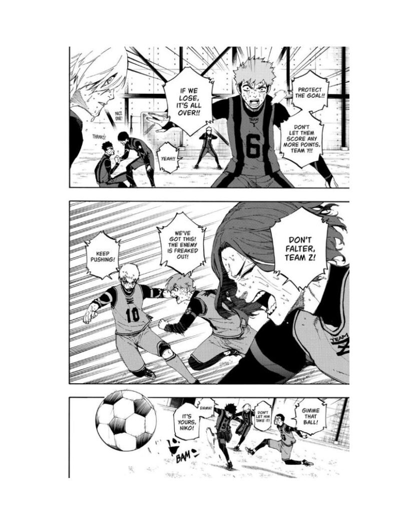 Team Z faces Team X, their first opponents. The match starts chaotically — everyone wants the ball. However, the opposing team’s leader, Shoei Baro, quickly takes control, scoring multiple goals effortlessly. His confidence and dominance terrify Team Z.