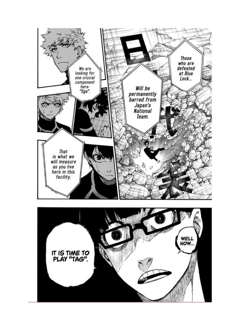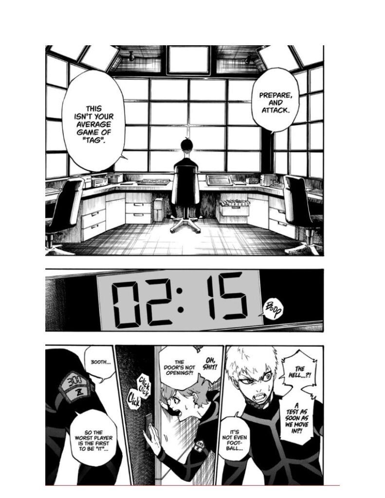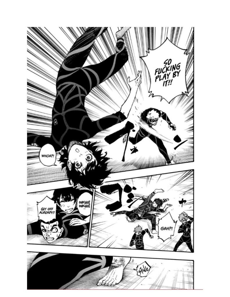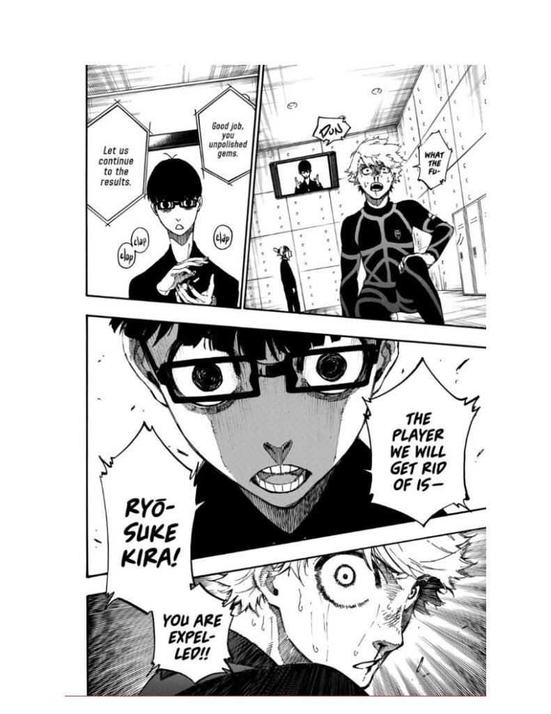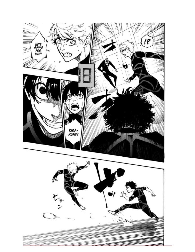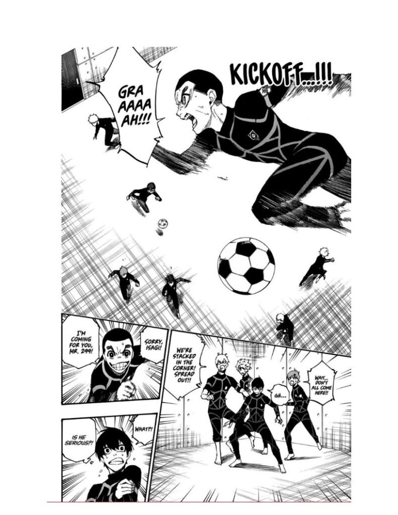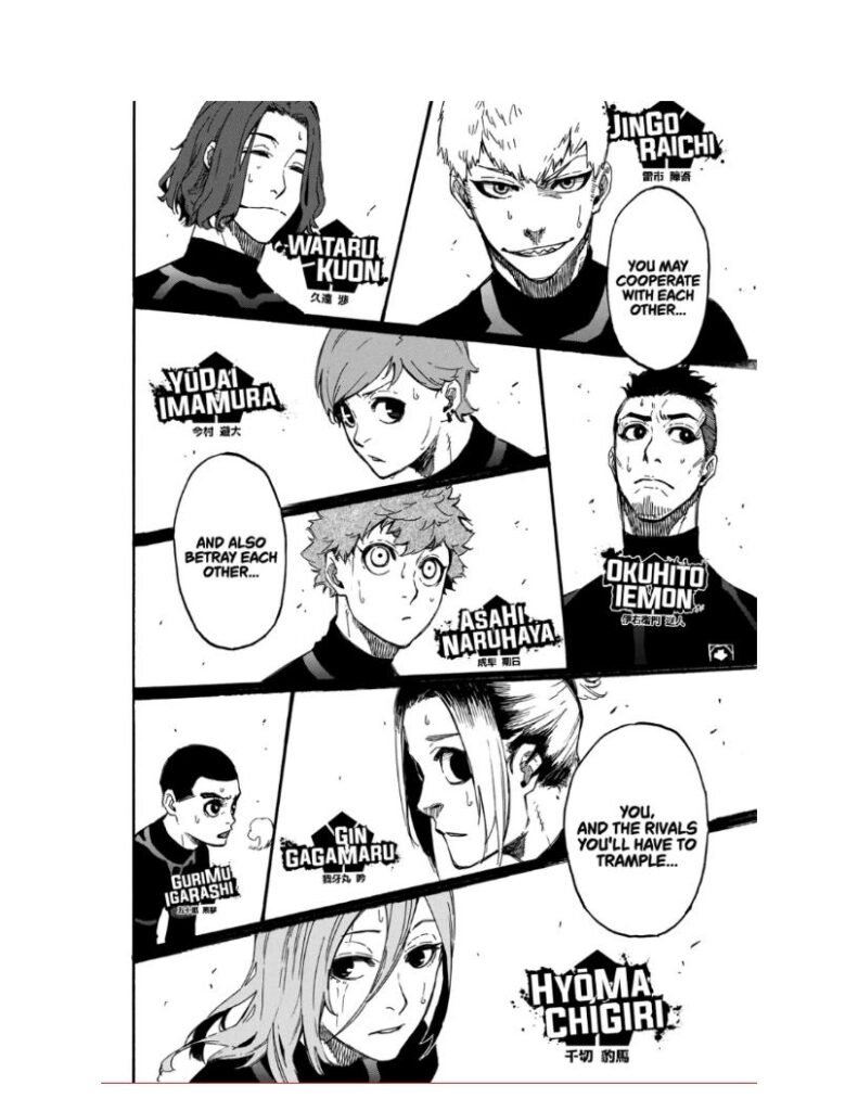 In this chapter, Coach Jinpachi Ego wastes no time proving his point. He throws all the players into a “tag-style” elimination game where the slowest, weakest, or most hesitant forward will be expelled from Blue Lock immediately.