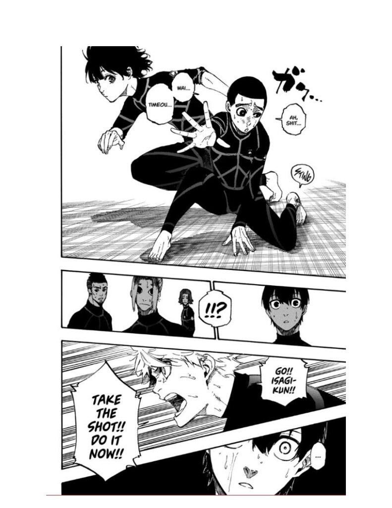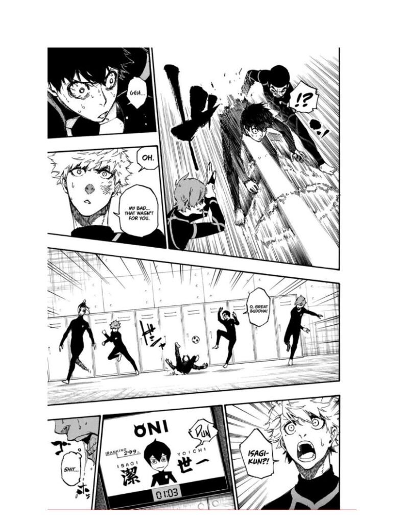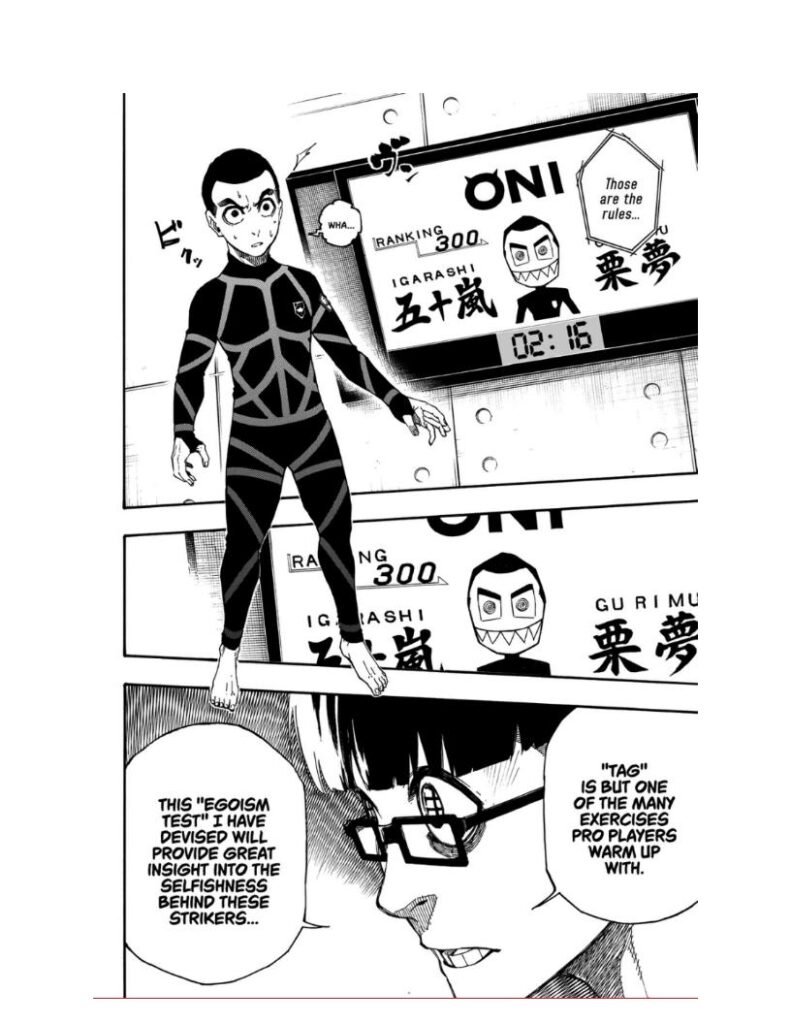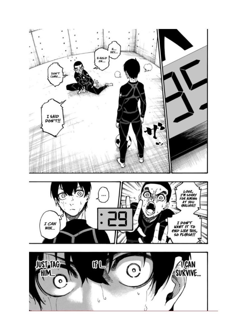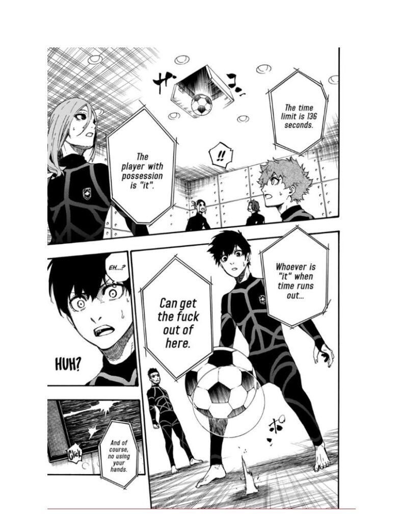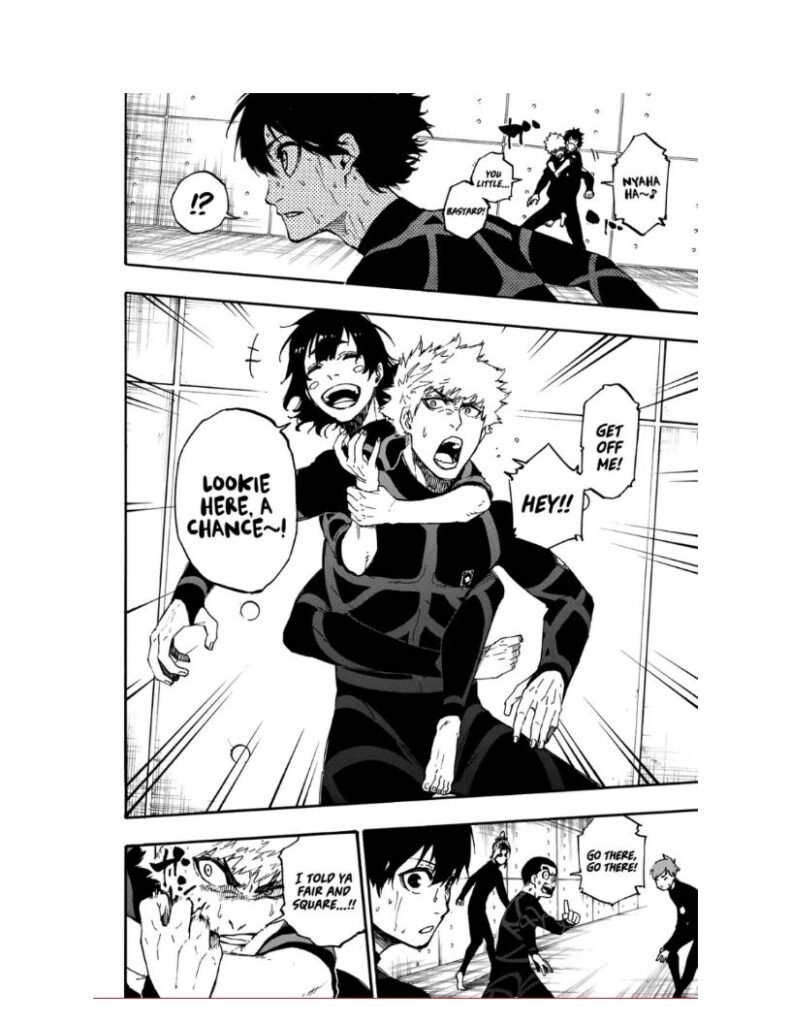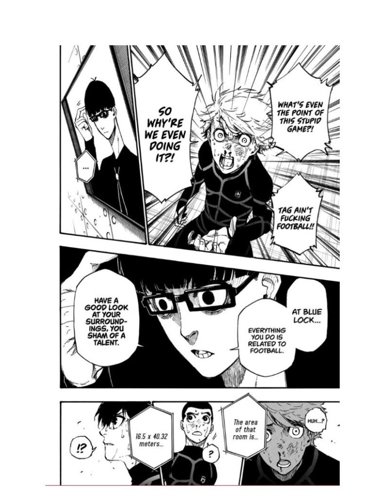 In this chapter, Coach Jinpachi Ego wastes no time proving his point. He throws all the players into a “tag-style” elimination game where the slowest, weakest, or most hesitant forward will be expelled from Blue Lock immediately.