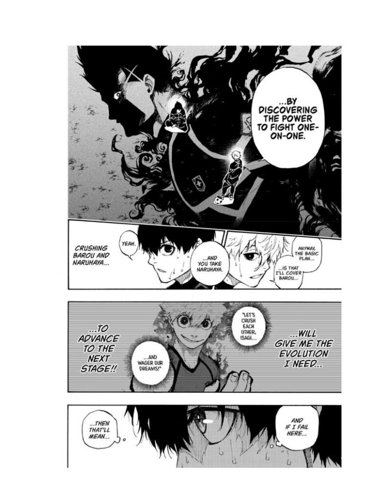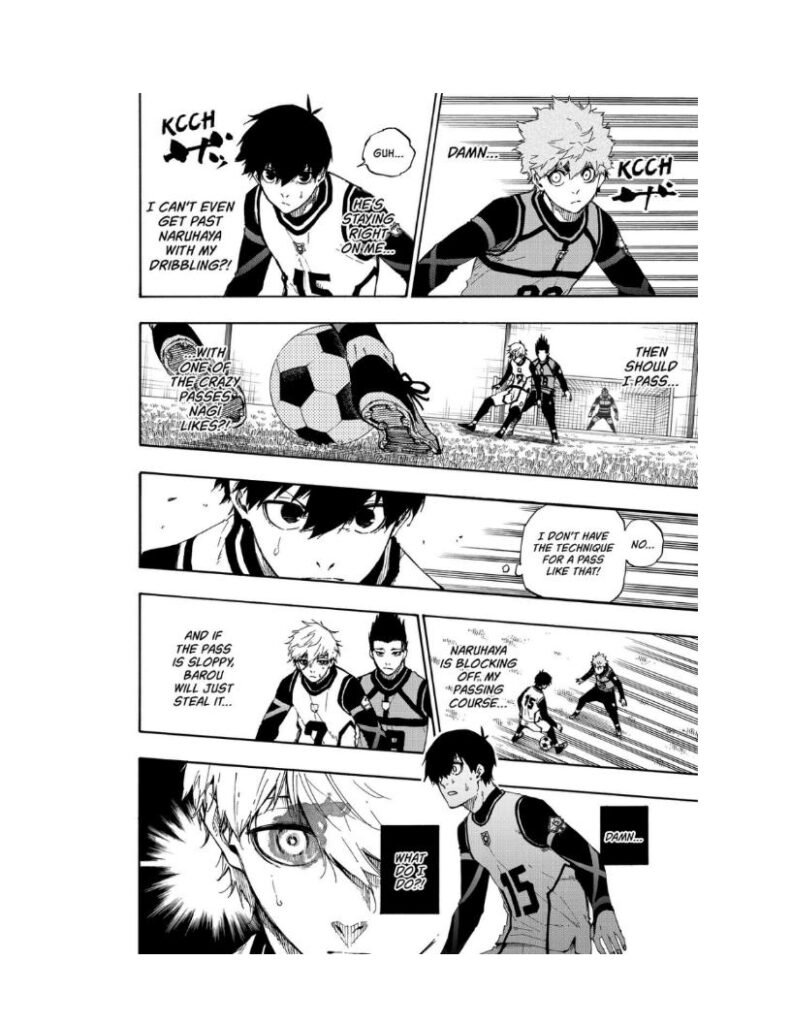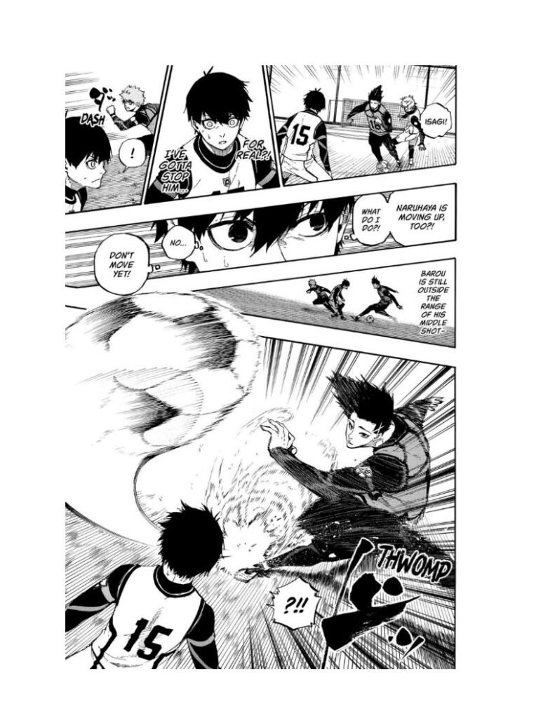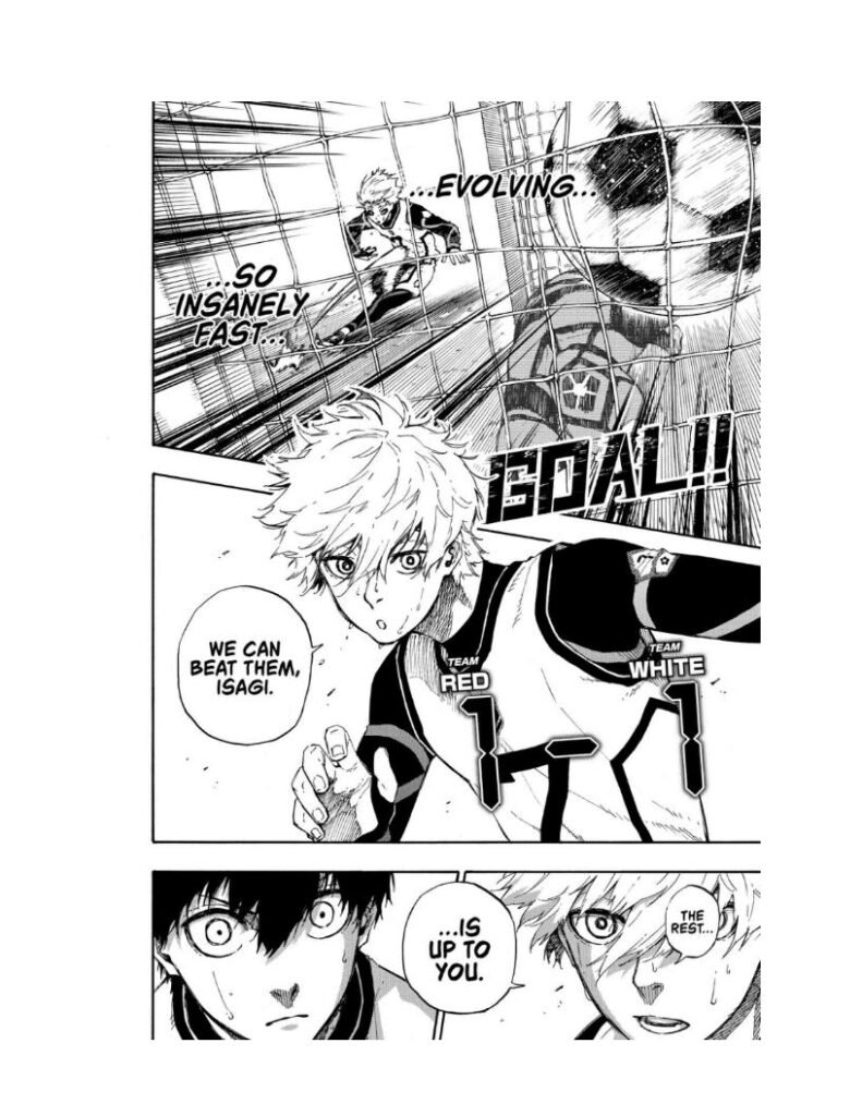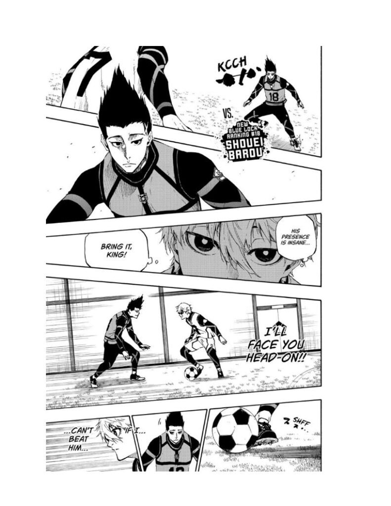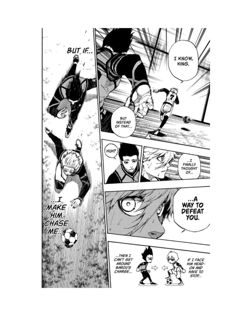 Nagi and Bachira push to support Isagi, but Rin overwhelms them with anticipation. Barou becomes frustrated, attempting to break through alone, but Aryu shuts him down with effortless defense.